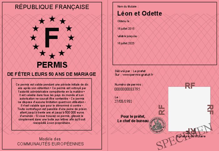 Envoyez par email le Permis de fêter leurs 50 ans de mariage personalisé