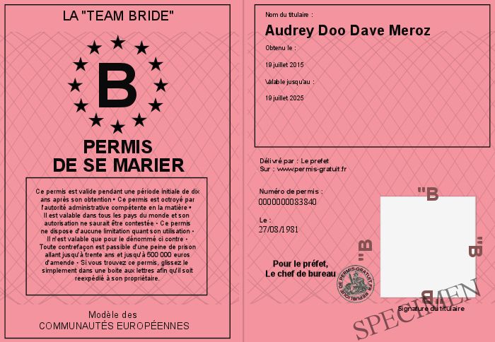 Envoyez par email le Permis de se marier personalisé par la La -Team Bride- ! Personnaliser mon permis