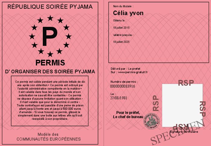 Envoyez par email le Permis d' organiser des soirée pyjama personalisé