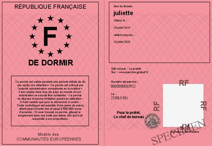 Envoyez par email le de dormir personalisé par la République Française ! Personnaliser mon permis