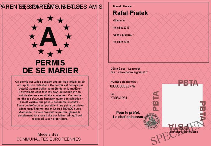 Envoyez par email le Permis de se marier personalisé