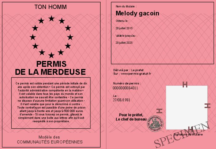 Envoyez par email le Permis De la merdeuse personalisé par la Ton homm ! Personnaliser mon permis