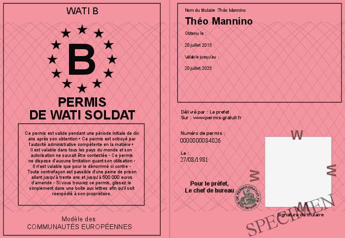 Envoyez par email le Permis de Wati soldat personalisé par la Wati b ! Personnaliser mon permis