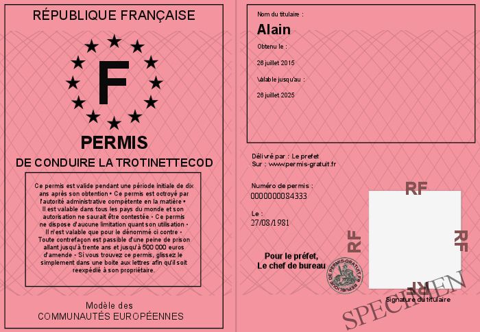 Envoyez par email le Permis de conduire la trotinettecod personalisé