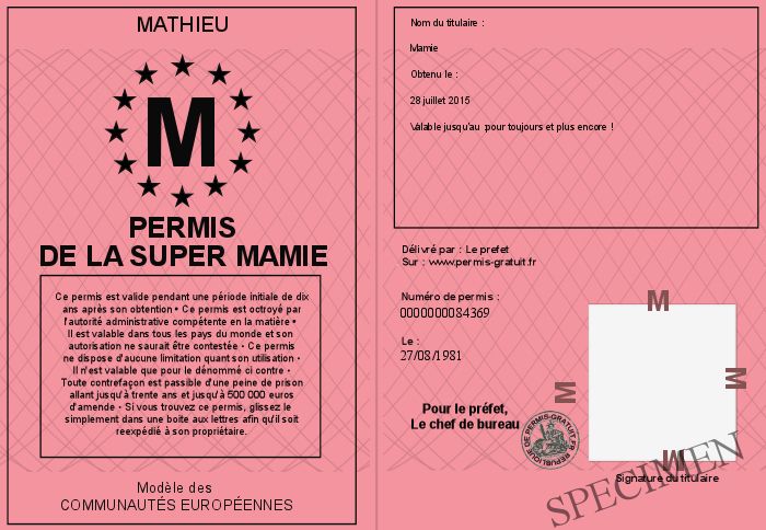 Envoyez par email le Permis de la Super Mamie personalisé par la MATHIEU ! Personnaliser mon permis