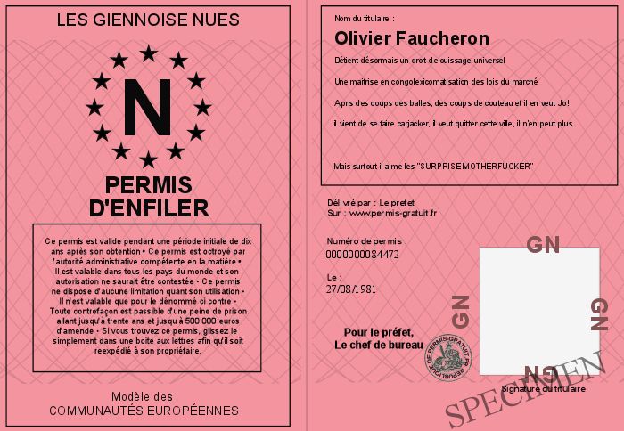 Envoyez par email le Permis d'enfiler personalisé par la Les giennoise nues ! Personnaliser mon permis