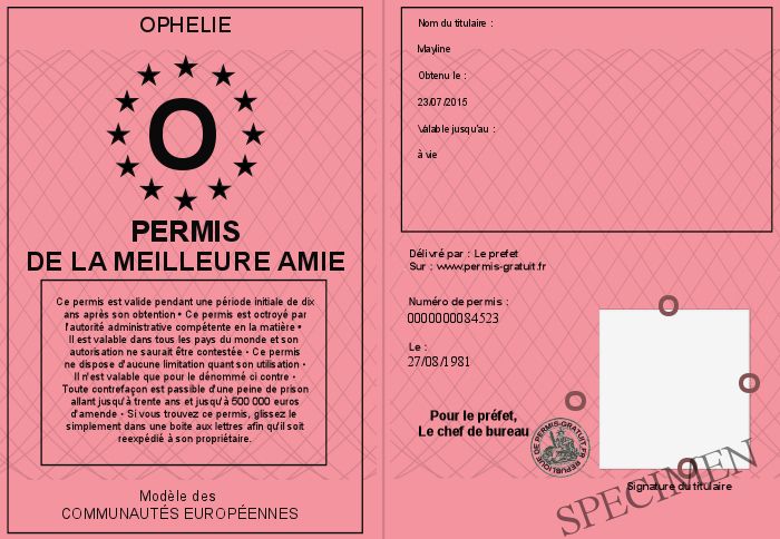 Envoyez par email le Permis de la meilleure amie personalisé par la OPHELIE ! Personnaliser mon permis