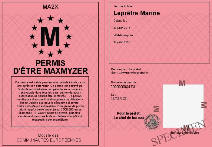 Envoyez par email le Permis d'être Maxmyzer personalisé par la Ma2x ! Personnaliser mon permis