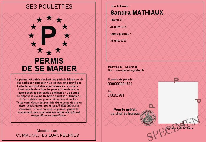 Envoyez par email le Permis de se marier personalisé par la Ses Poulettes ! Personnaliser mon permis