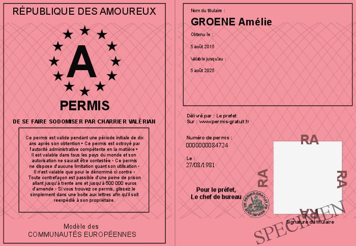 Envoyez par email le Permis de se faire sodomiser par CHARRIER Valérian personalisé