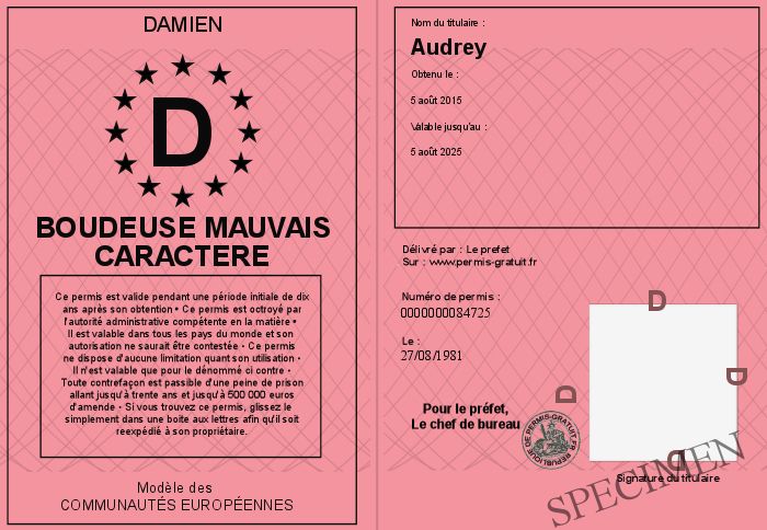 Envoyez par email le Boudeuse mauvais caractere personalisé par la Damien ! Personnaliser mon permis