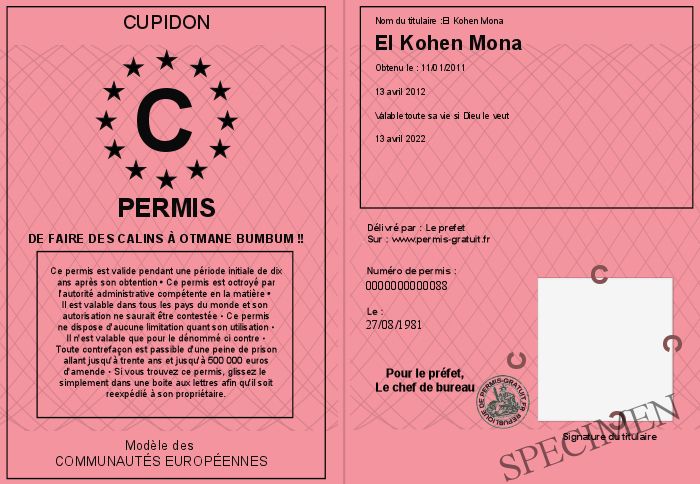 Envoyez par email le Permis de Faire des Calins à Otmane Bumbum !! personalisé