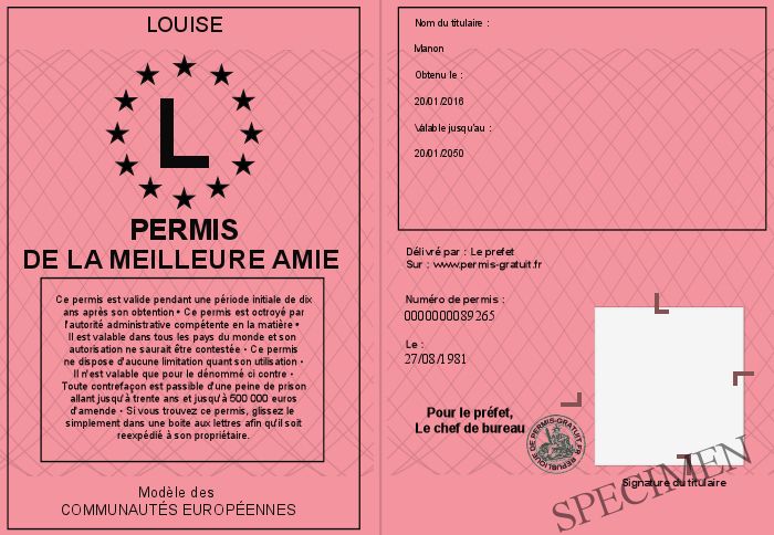 Envoyez par email le Permis de la meilleure amie personalisé par la Louise ! Personnaliser mon permis