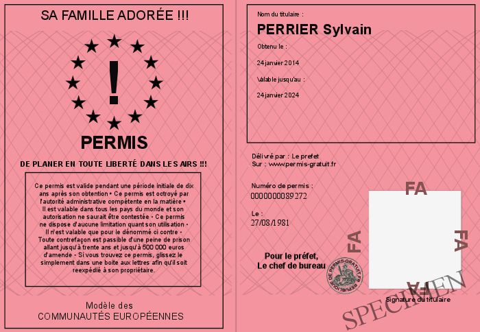 Envoyez par email le Permis de planer en toute liberté dans les airs !!! personalisé