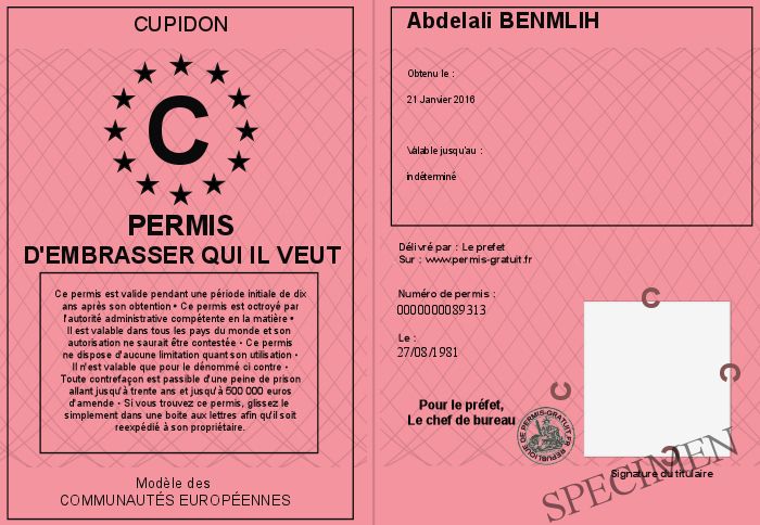 Envoyez par email le Permis d'embrasser qui il veut personalisé