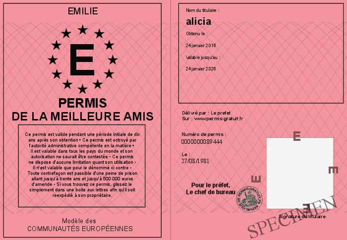 Envoyez par email le permis de la meilleure amis personalisé par la emilie ! Personnaliser mon permis