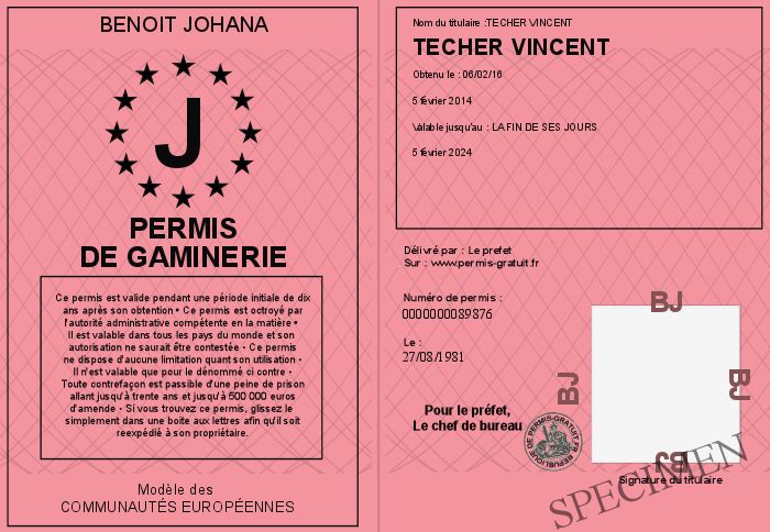 Envoyez par email le Permis de gaminerie personalisé par la BENOIT JOHANA ! Personnaliser mon permis