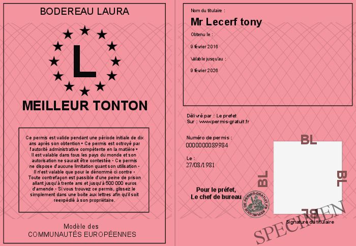Envoyez par email le meilleur tonton personalisé par la Bodereau laura ! Personnaliser mon permis