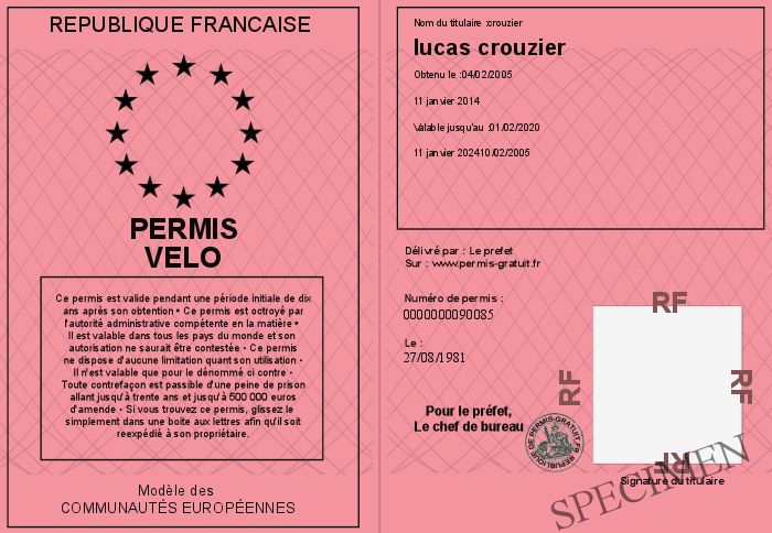 Envoyez par email le Permis velo personalisé par la republique francaise ! Personnaliser mon permis