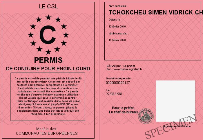 Envoyez par email le Permis de conduire POUR ENGIN LOURD personalisé