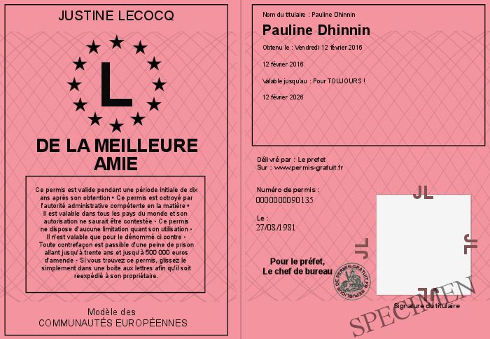Envoyez par email le de la Meilleure Amie personalisé par la Justine Lecocq ! Personnaliser mon permis