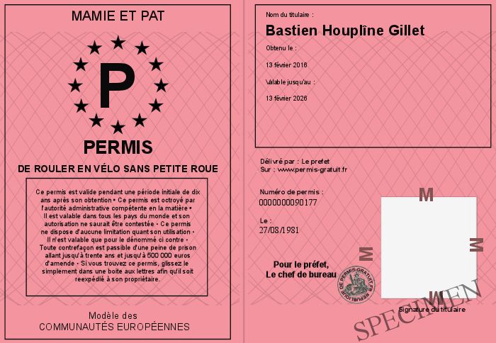 Envoyez par email le Permis de rouler en vélo sans petite roue personalisé