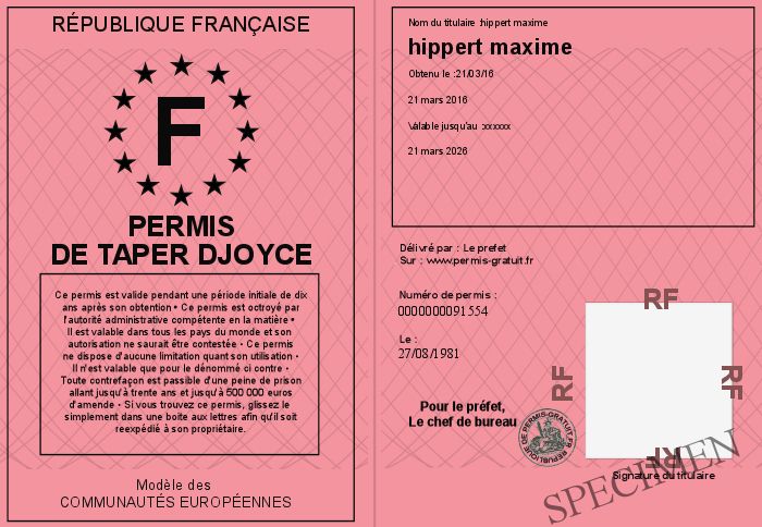 Envoyez par email le Permis de taper djoyce personalisé