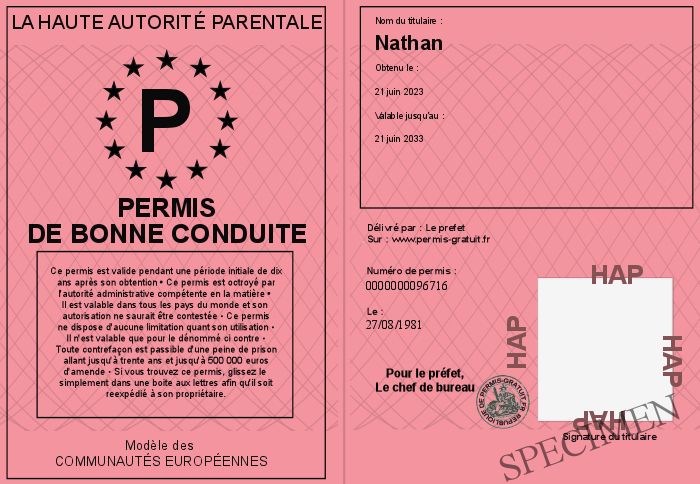 Envoyez par email le Permis de bonne conduite personalisé