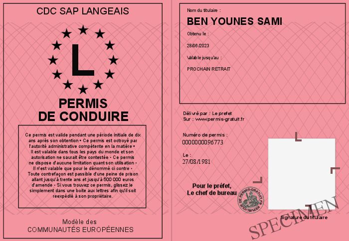 Envoyez par email le Permis de conduire personalisé par la CdC SAP LANGEAIS ! Personnaliser mon permis