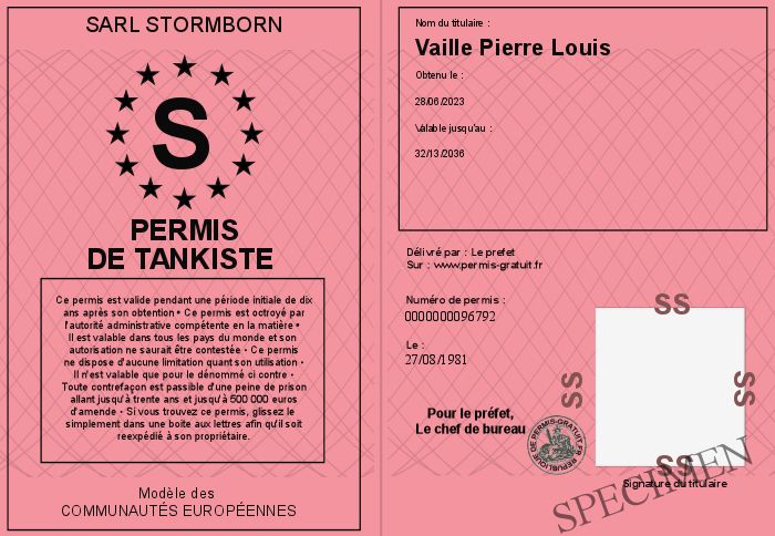 Envoyez par email le Permis de Tankiste personalisé par la SARL Stormborn ! Personnaliser mon permis