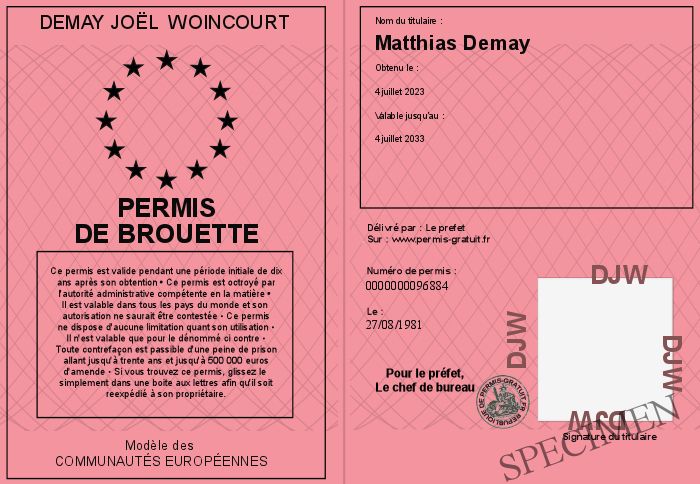 Envoyez par email le Permis de Brouette personalisé