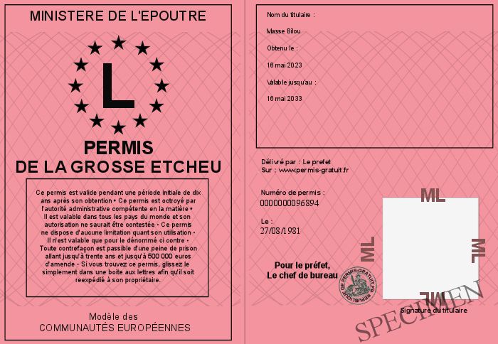 Envoyez par email le PERMIS DE LA GROSSE ETCHEU personalisé