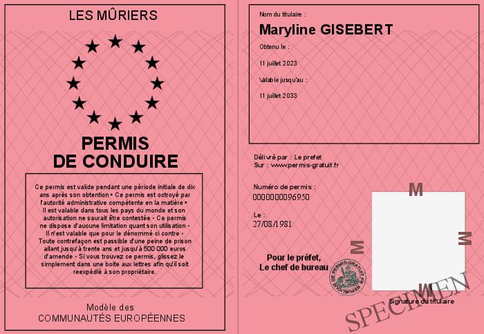 Envoyez par email le Permis de conduire personalisé par la Les Mûriers ! Personnaliser mon permis