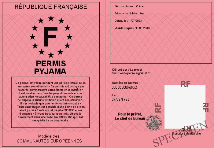 Envoyez par email le Permis PYJAMA personalisé par la République Française ! Personnaliser mon permis