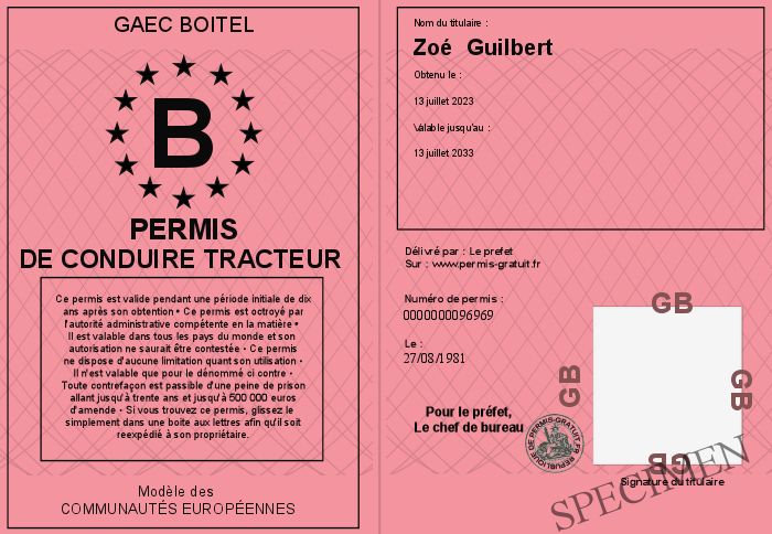 Envoyez par email le Permis de conduire tracteur personalisé