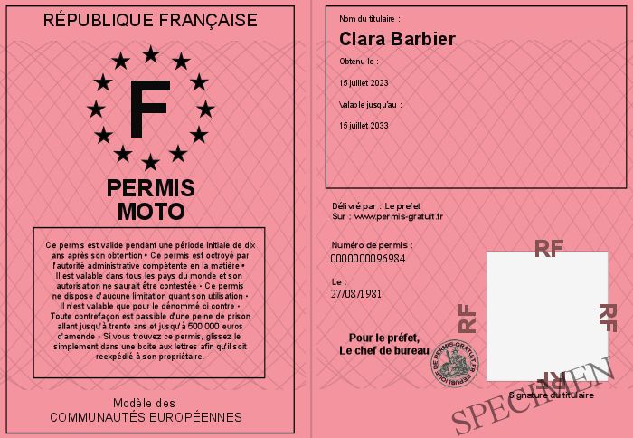 Envoyez par email le Permis moto personalisé par la République Française ! Personnaliser mon permis