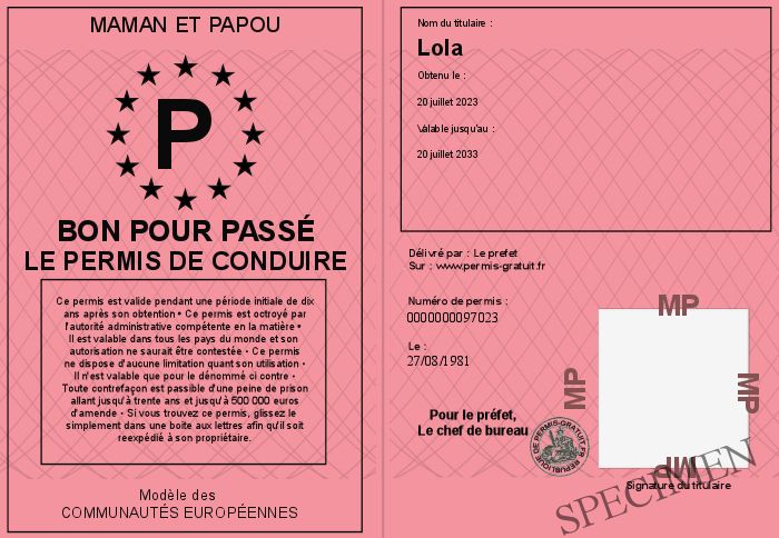 Envoyez par email le Bon pour passé le Permis de conduire personalisé