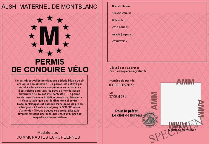 Envoyez par email le Permis de conduire vélo personalisé