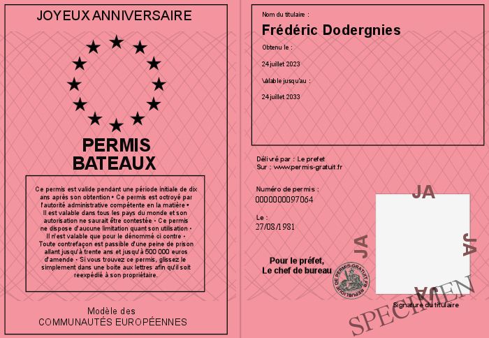 Envoyez par email le Permis bateaux personalisé par la JOYEUX ANNIVERSAIRE ! Personnaliser mon permis