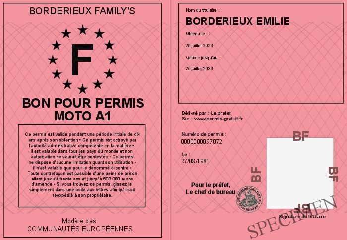 Envoyez par email le BON POUR PERMIS MOTO A1 personalisé