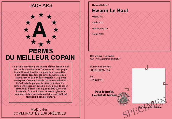 Envoyez par email le Permis du meilleur copain personalisé par la Jade Ars ! Personnaliser mon permis